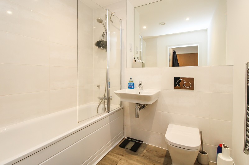 Comprising an enclosed bath tub, wall mounted shower, wash hand basin, low flush WC, heated towel rail.