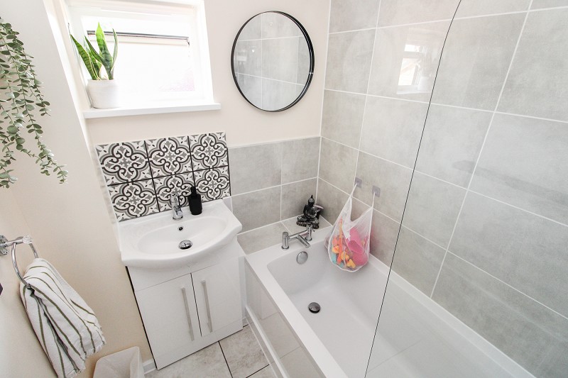 Comprising an enclosed bath tub, wall mounted shower, wash hand basin, part tiled walls, radiator.