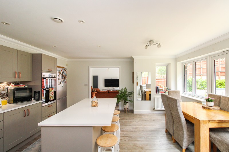 Equipped in a range of base and eye level units with island, double oven, hob with extractor hood over, inset sink with mixer tap, space for fridge/freezer, integrated dishwasher, two radiators, windows to rear.