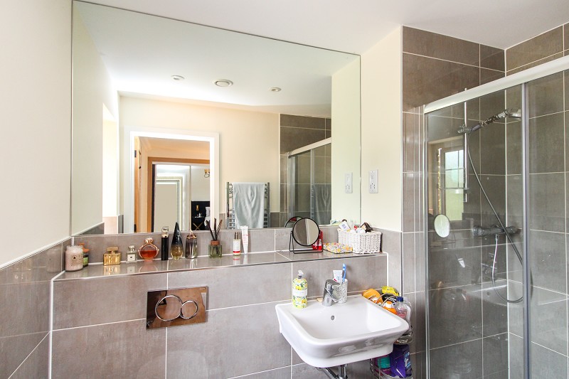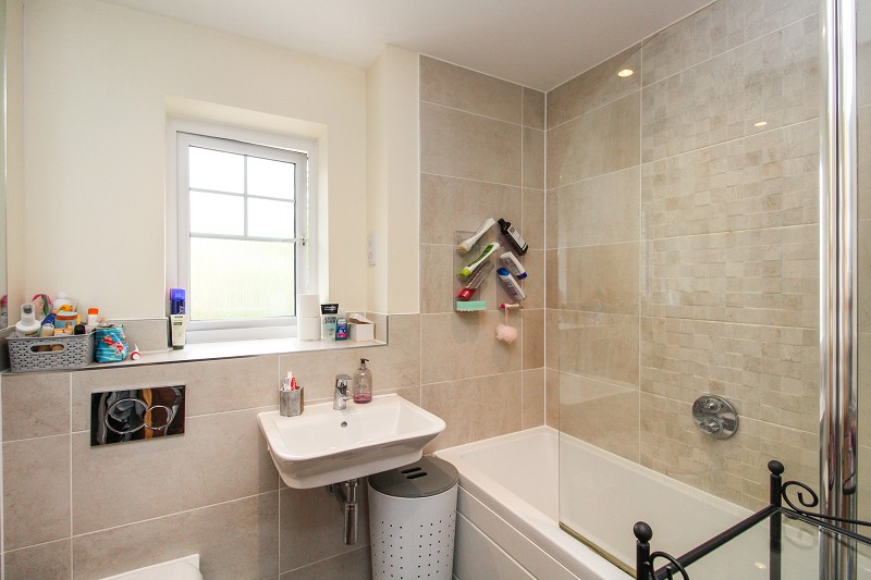 Comprising an enclosed bath tub, wall mounted shower, low flush WC, wash hand basin, part tiled walls, window, heated towel rail.