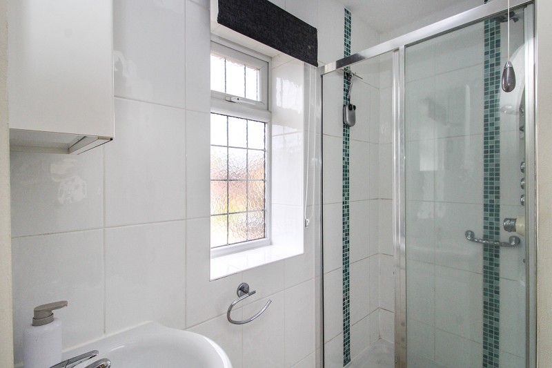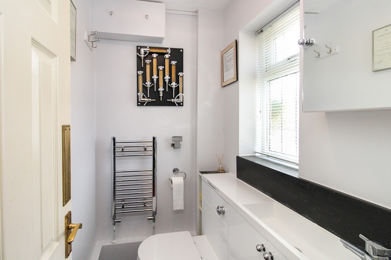 Low flush WC, vanity wash hand basin, heated towel rail, window.