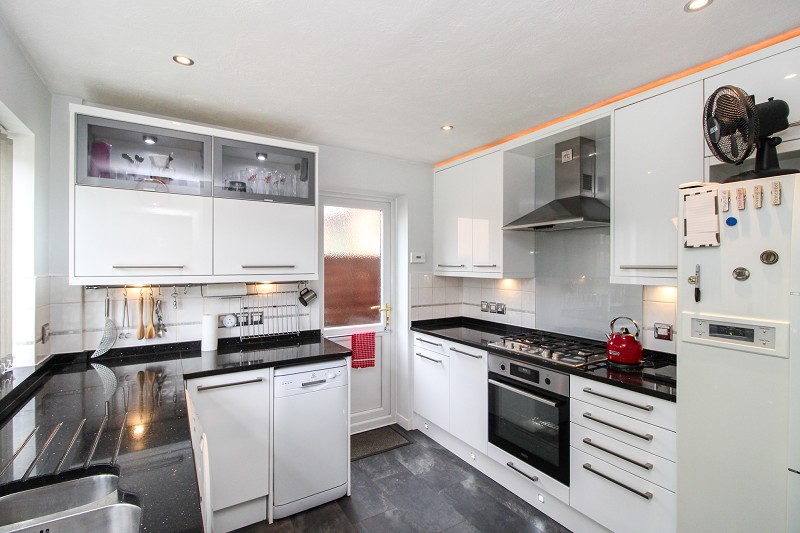 Equipped in a range of base and eye level units comprising an inset sink with mixer tap, oven with hob and extractor hood over, space for fridge/freezer, space for washing machine, space for slim dishwasher, door to side access, part tiled walls, cupboard housing boiler, window to front.