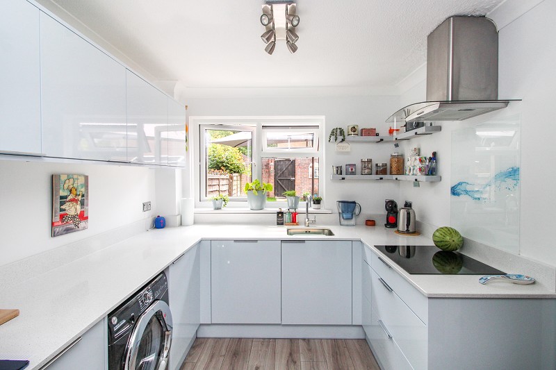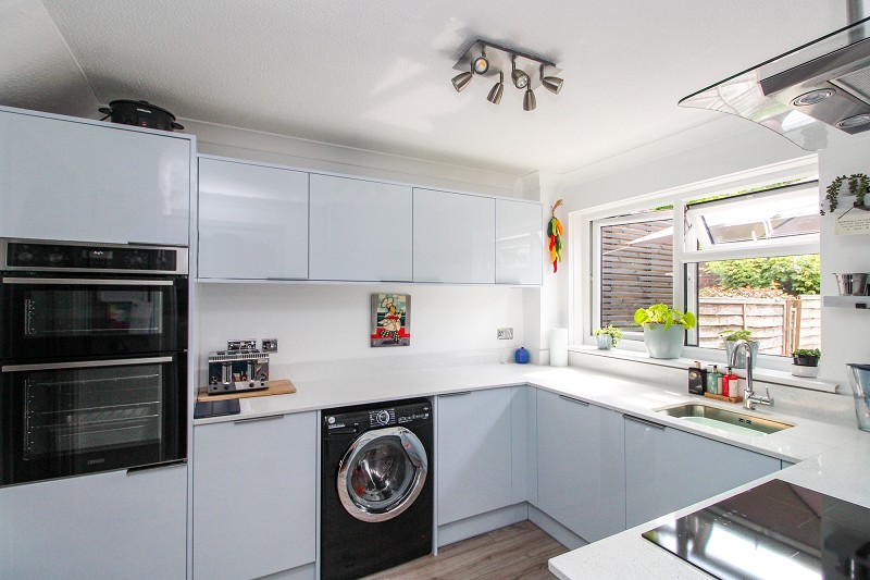 Equipped in a range of base and eye level units with quartz work surfaces, inset sink with mixer tap, built in double oven, induction hob with extractor hood over, integrated dishwasher, space for washing machine, space for fridge/freezer, window to rear.