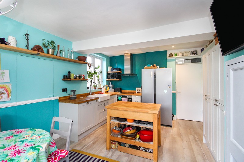 Equipped in a range of base level units comprising an inset sink with mixer tap, built in double oven, hob with extractor hood over, space for fridge/freezer, integrated dishwasher, window to side, radiator, doors to rear garden and utility area.