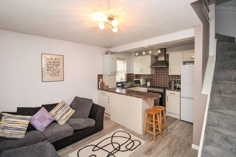Equipped in a range of base and eye level units comprising a stainless steel sink with draining board and mixer tap, space for oven with extractor hood over, space for washing machine, space for fridge/freezer, under stairs cupboard, windows to front and side, wall mounted boiler, two radiators, TV Point, stairs to first floor.