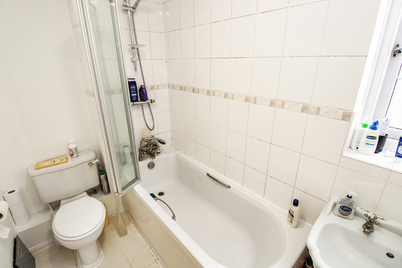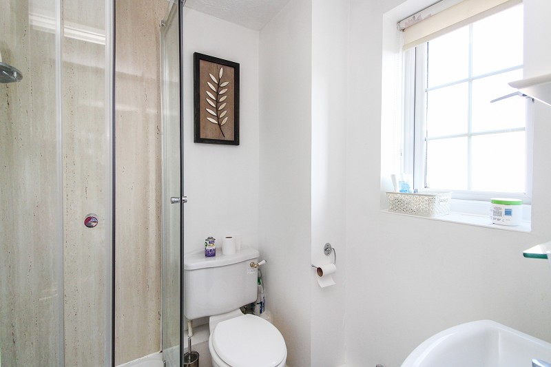 Comprising a corner shower cubicle, low flush WC, wash hand basin, window, radiator.