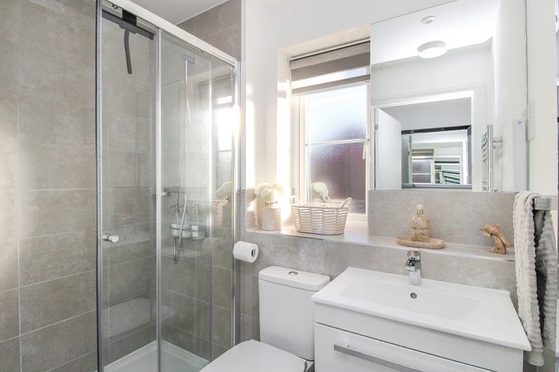 Comprising a shower cubicle, vanity wash hand basin, heated towel rail, low flush WC, part tiled walls, window.