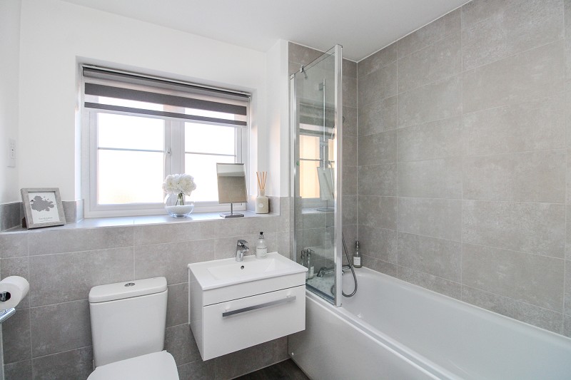 Comprising an enclosed bath tub with wall mounted shower attachment, vanity wash hand basin, low flush WC, heated towel rail, part tiled walls, window.