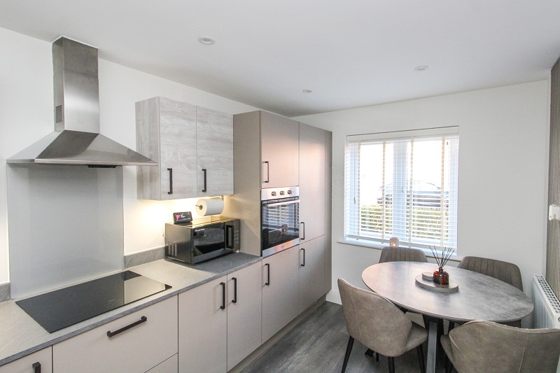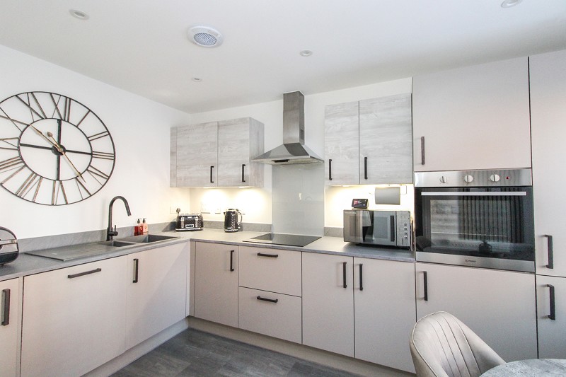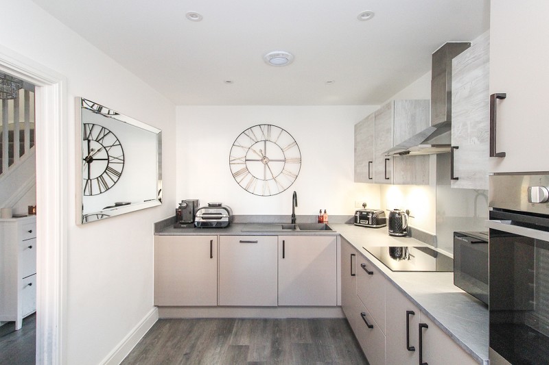 Equipped in a range of base and eye level units comprising an inset sink with draining board and mixer tap, built in oven, induction hob with extractor hood over, integrated fridge/freezer, integrated dishwasher, integrated washing machine, window to front, radiator.