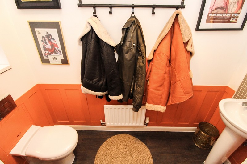 Comprising an enclosed bath tub, wall mounted shower, low flush WC, wash hand basin, heated towel rail, part tiled walls, extractor fan.