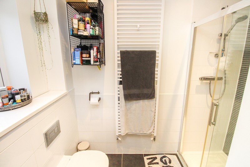 Comprising a shower cubicle, low flush WC, wash hand basin, heated towel rail, part tiled walls, window.