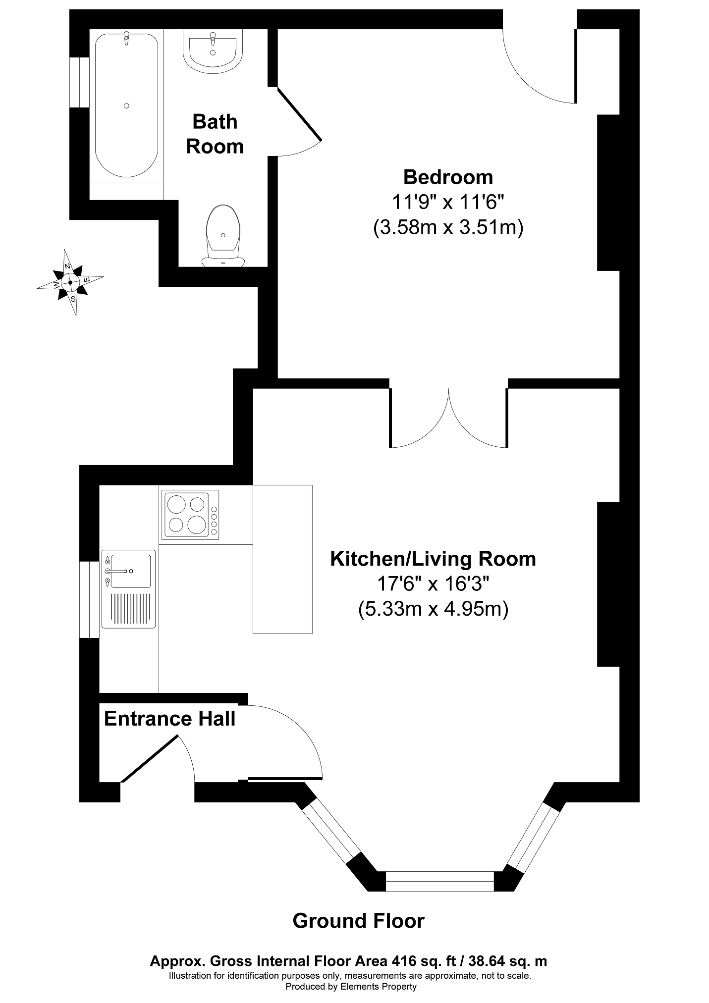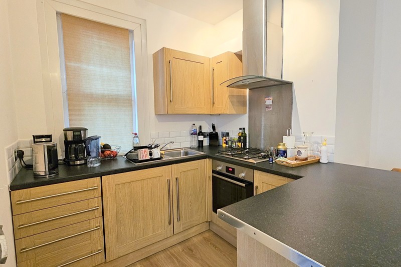 Base and eye level units comprising a stainless steel sink with draining board and mixer tap, oven with hob and extractor hood over, integrated fridge, integrated washing machine, window to side, bay window to front, two radiators, TV Point, door to;