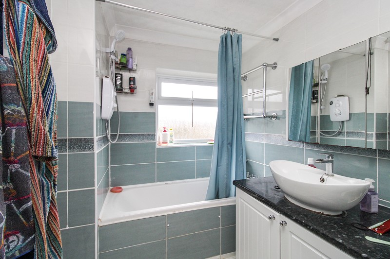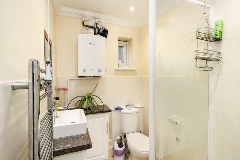 Comprising a shower cubicle, low flush WC, wash hand basin, heated towel rail, part tiled walls, window, wall mounted boiler.
