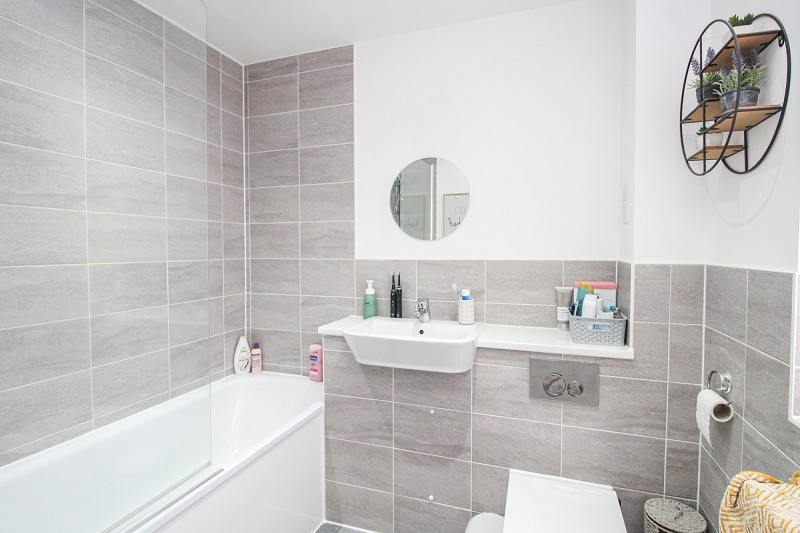 Comprising an enclosed bath tub, wall mounted shower, low flush WC, wash hand basin, part tiled walls, radiator, window.