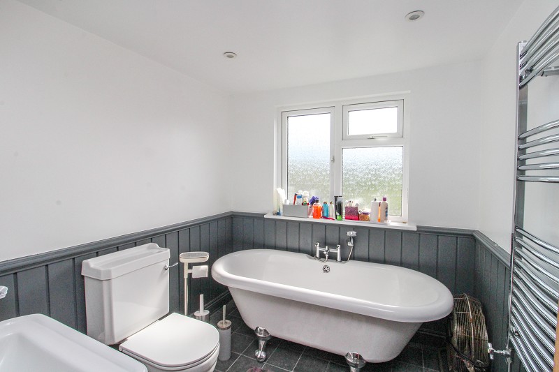 Comprising a bath tub, low flush WC, wash hand basin, heated towel rail, window.