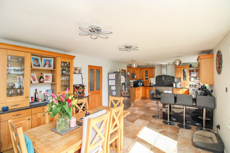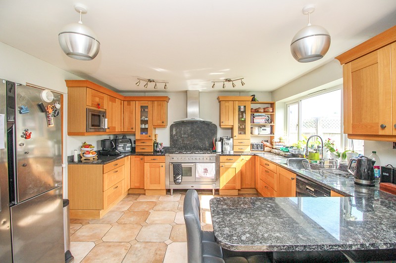 Equipped in a range of base and eye level units with granite worktops, inset sink with mixer tap, Range style oven with hob and extractor hood over, space for dishwasher and fridge/freezer, windows to side and rear, patio doors to rear garden.